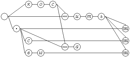 Синхронизированное линейное дерево, изображенное на рис.5 переходит в состояние "." при подаче на его вход спецсимвола ".", потом в состояние ". к" при подаче символа "к", далее последовательно ". ко", ". кос", ". косе", и затем одновременно два субсостояния ". косе% " и ". косе$ ", при подаче соответственно "о", " с", " е", "_".